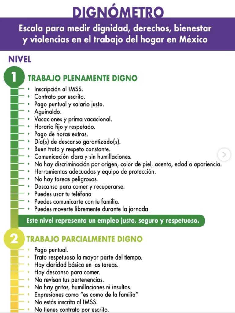 El “dignómetro” tiene cuatro escalas, la primera se llama “trabajo plenamente digno”, en la que se incluyen prácticas mínimas como inscripción al IMSS, contrato por escrito, aguinaldo, herramientas adecuadas y equipo de protección, hasta moverte libremente durante la jornada.