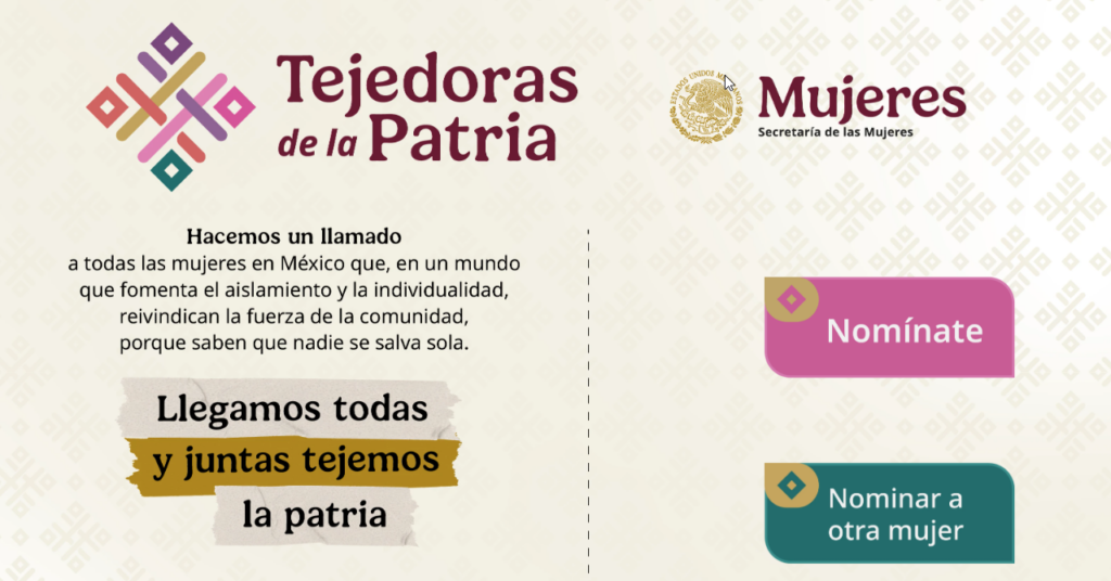 Para formar parte del programa puedes nominarte o nominar a otra mujer a través de esta página web: https://tejedorasdelapatria.mujeres.gob.mx/registro/inicio