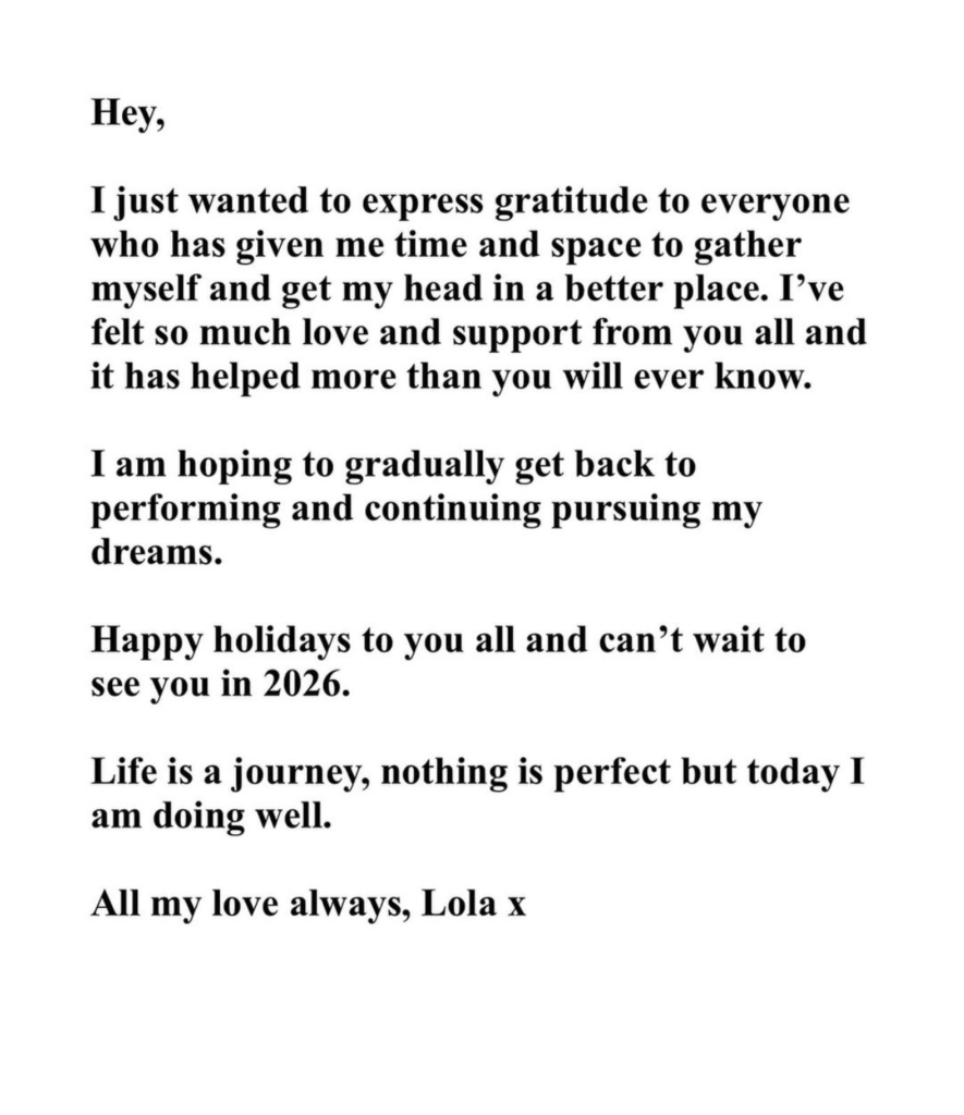 La cantautora Lola Young publicó a través de su cuenta de Instagram un mensaje agradeciendo a las personas que le han dado tiempo y espacio para recuperarse y poner su cabeza en un mejor sitio.