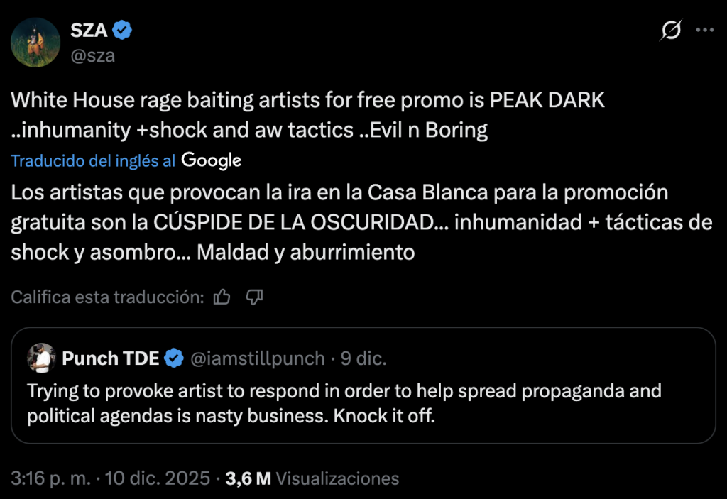 SZA acusó a la administración de Trump de “provocar la ira” de los artistas para poder conseguir “promoción gratuita son la CÚSPIDE DE LA OSCURIDAD… inhumanidad + tácticas de shock y asombro… Maldad y aburrimiento”, escribió en su cuenta de X.